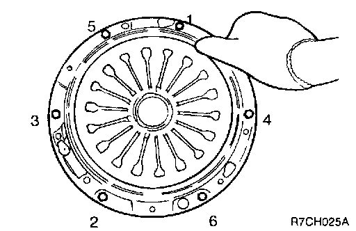 7. Loosen the bolts which attach the clutch cover to the flywheel in a star pattern. Loosen the bolts in succession, one or two turns at a time, to avoid bending the cover flange.