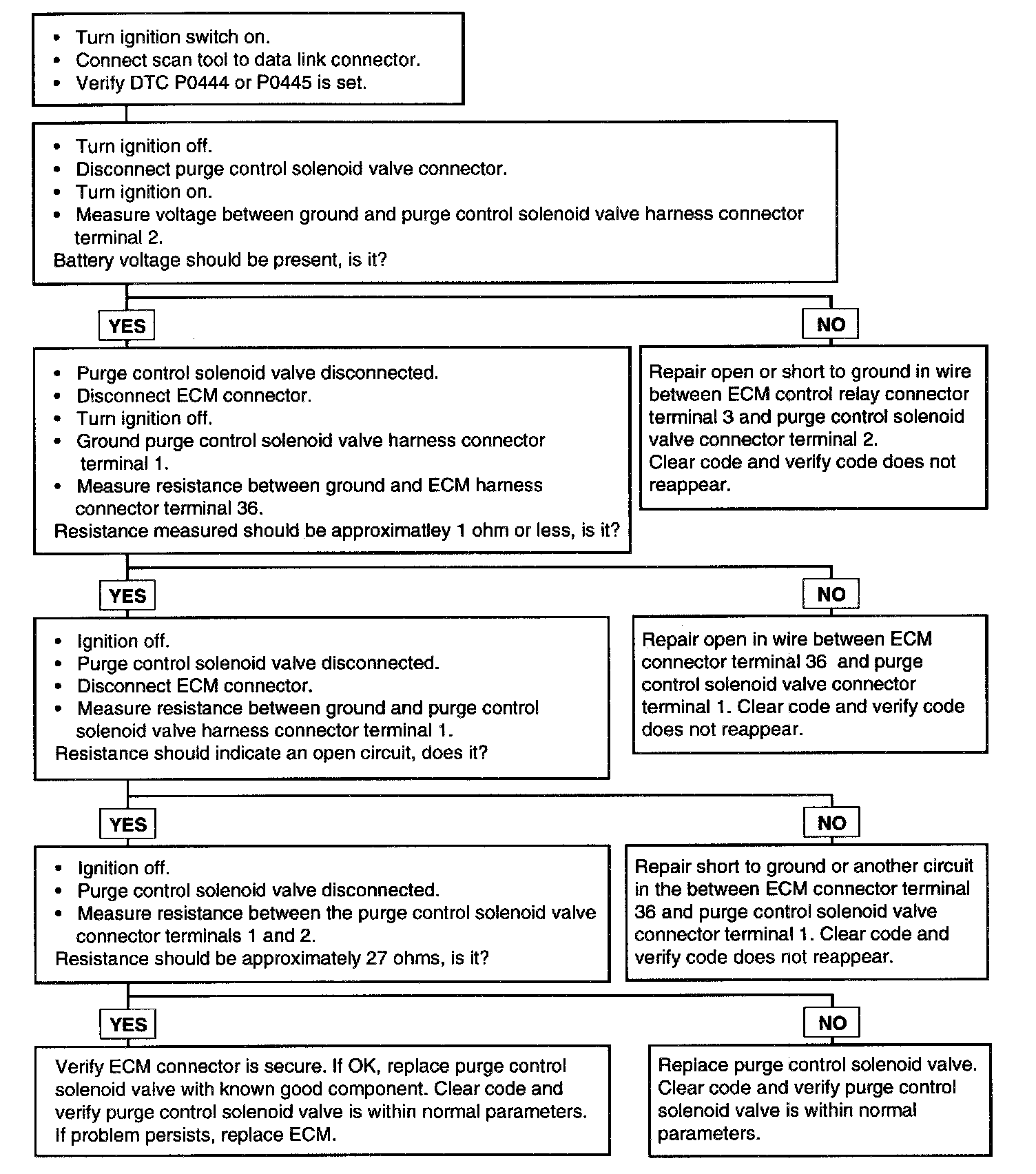 The ECM will set P0444 and the MIL will turn on if an open circuit is detected in the driver stage of the purge control solenoid circuit during two driving cycles.