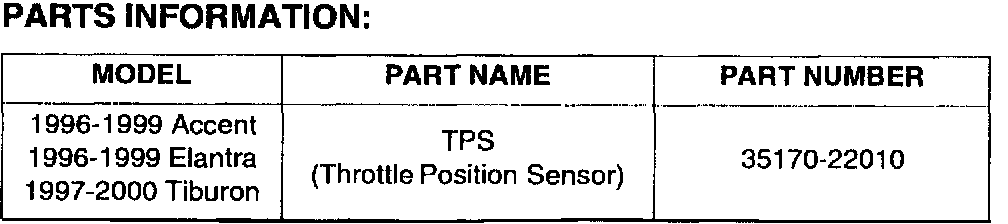 The Throttle Position Sensor (TPS) output signal is an important input for both the Engine and Transaxle Control Modules. A malfunctioning TPS may result in the following symptoms: