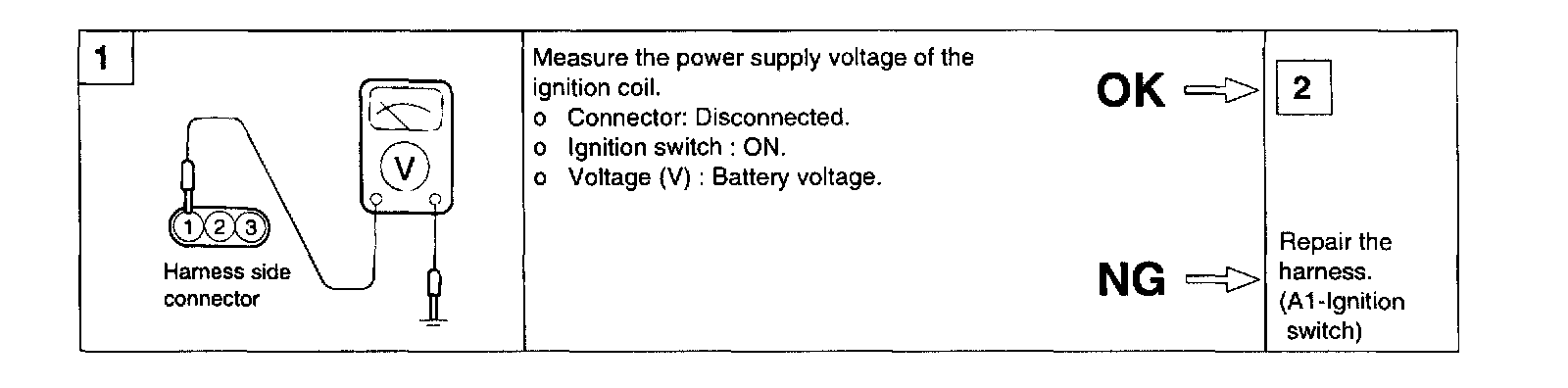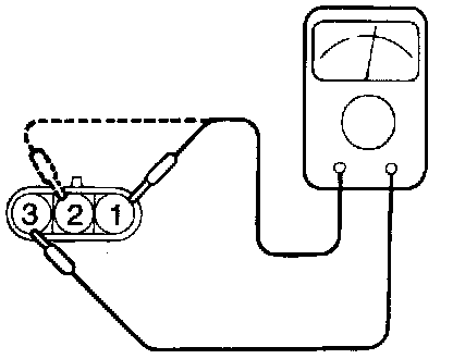 1. Measure the resistance between connector terminals 3 and 2 (the coils at the No.1 and No.4 cylinder sides) of the ignition coil, and between terminals 3 and 1 (the coils at the No.2 and No.3 cylinder sides).