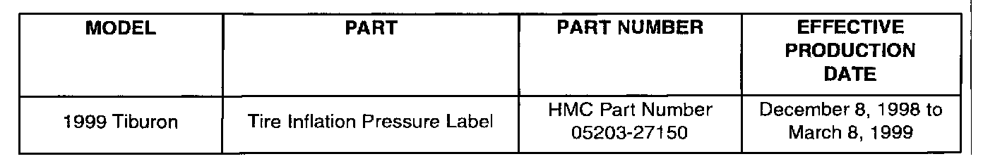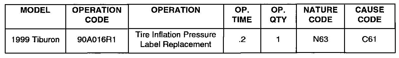 1999 TIBURON TIRE INFLATION PRESSURE LABEL REPLACEMENT PROCEDURE