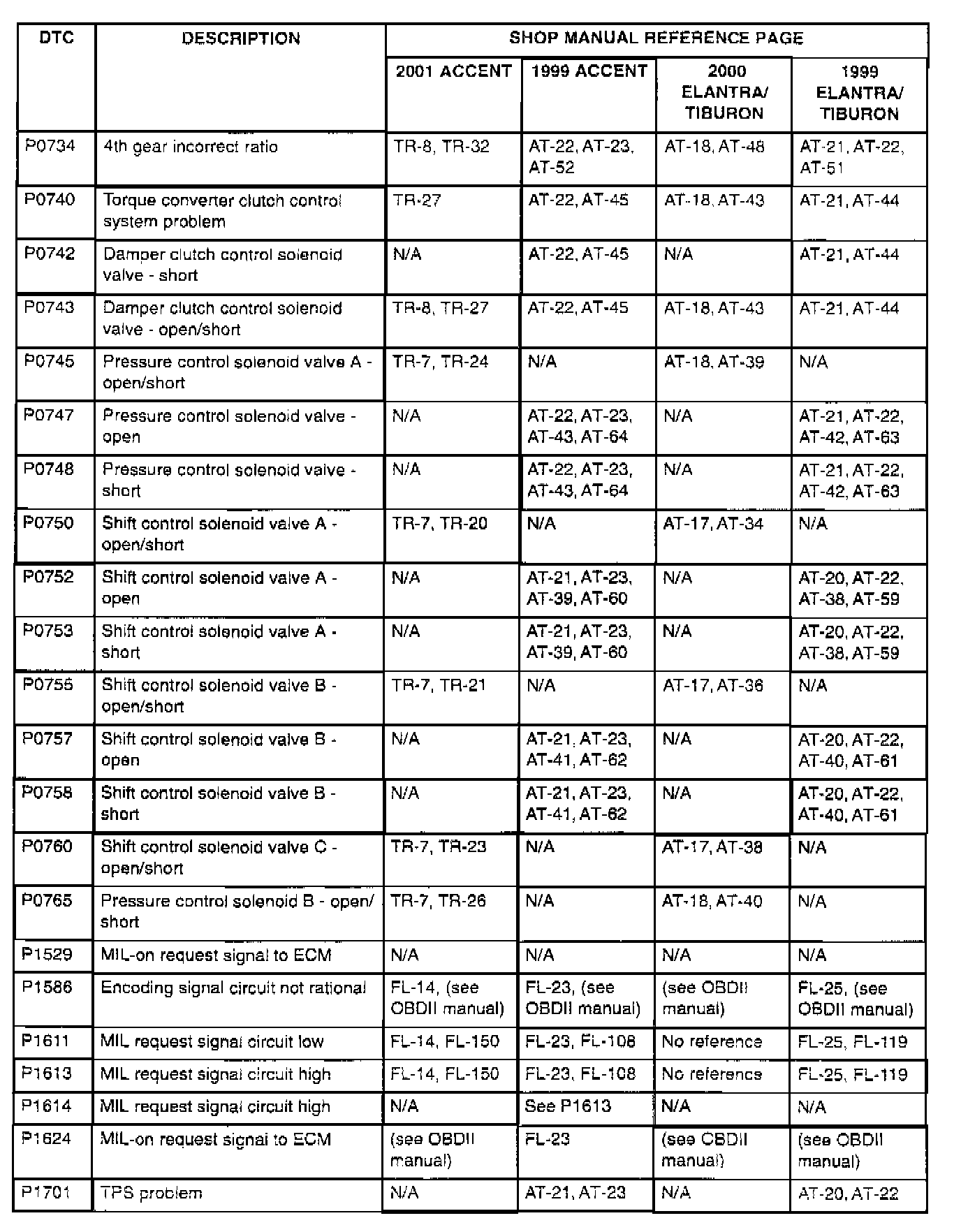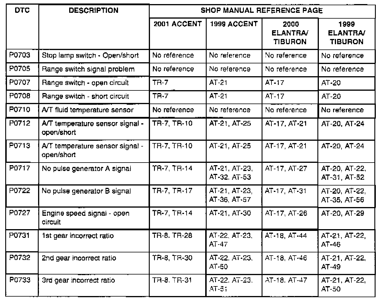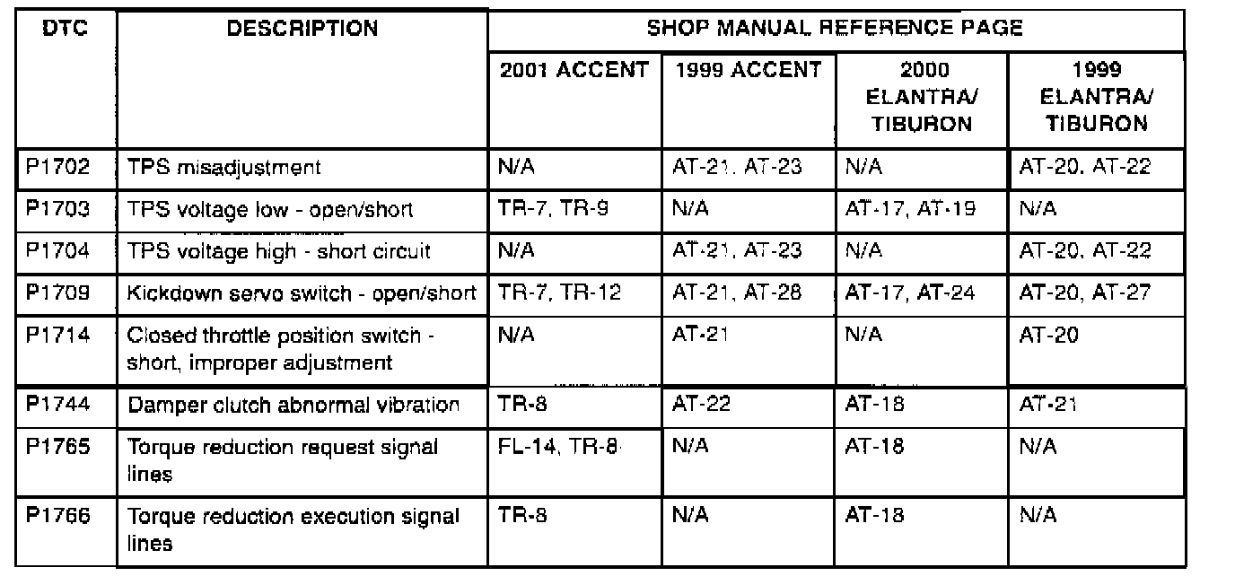 1999-2001 ACCENT, 1999-2000 ELANTRA/TIBURON TRANSAXLE DIAGNOSTIC TROUBLE CODES