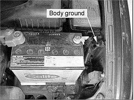 4. Clean the connection between the negative battery cable and the body ground bolt located next to the battery. Apply conductive grease to the connection before reinstalling the bolt.
