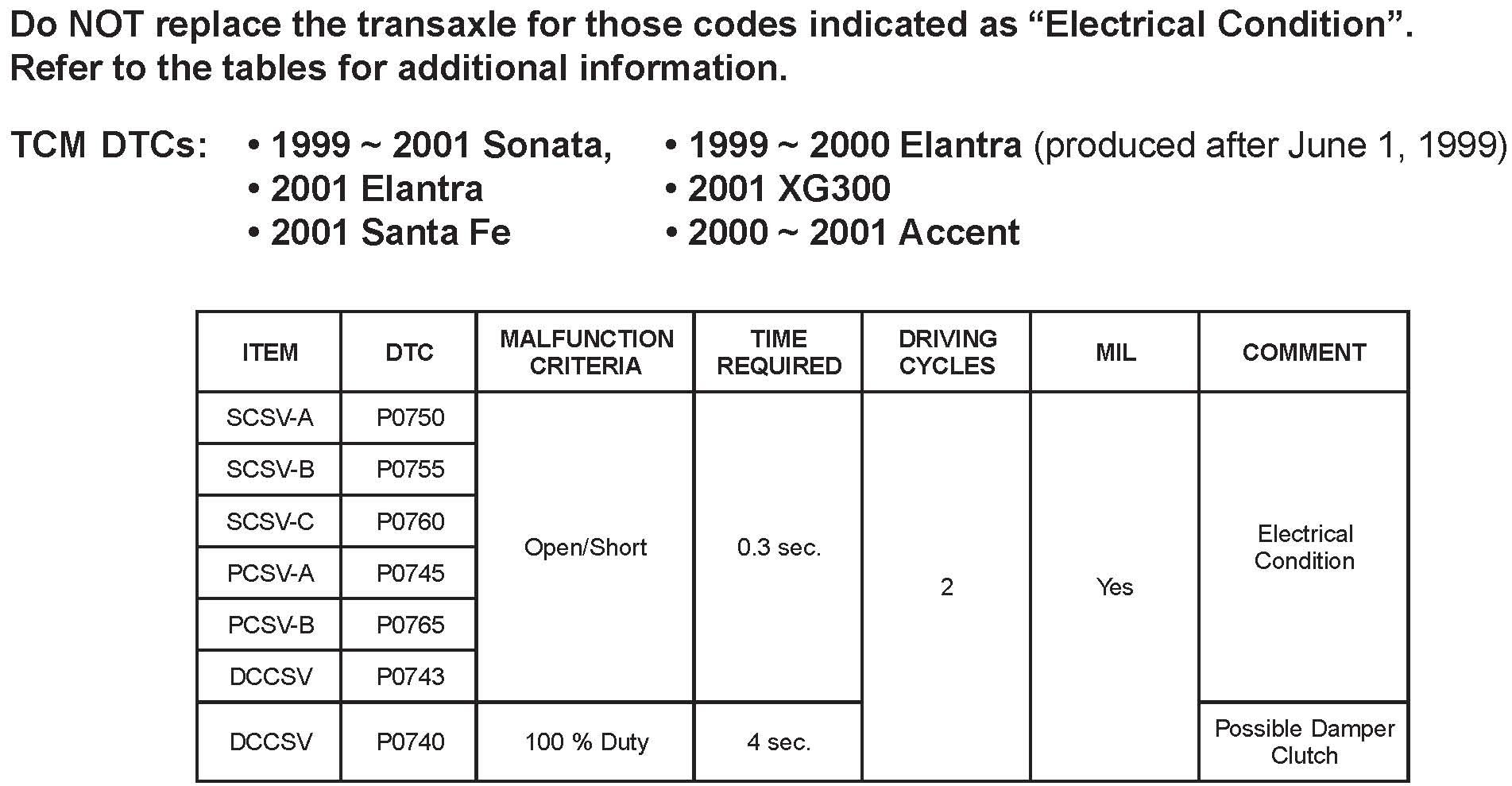 DO NOT replace an automatic transaxle for solenoid (SCSV) codes indicated as"Electrical Condition" in the "DTC Information" section of this bulletin. Instead, follow the repair procedure shown below.