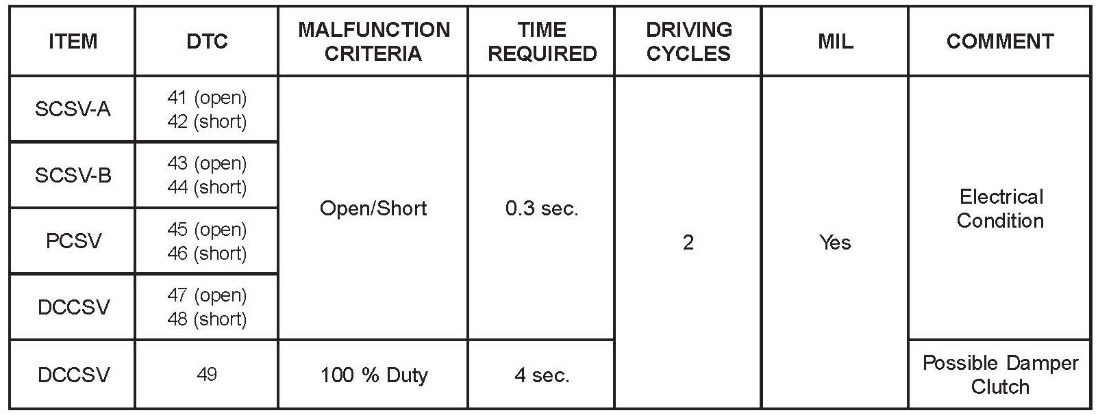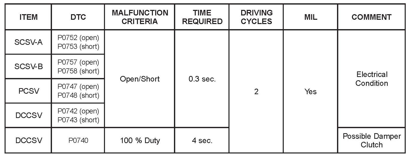 For your reference the logic that the TCM uses to set SCSV trouble codes are listed.
