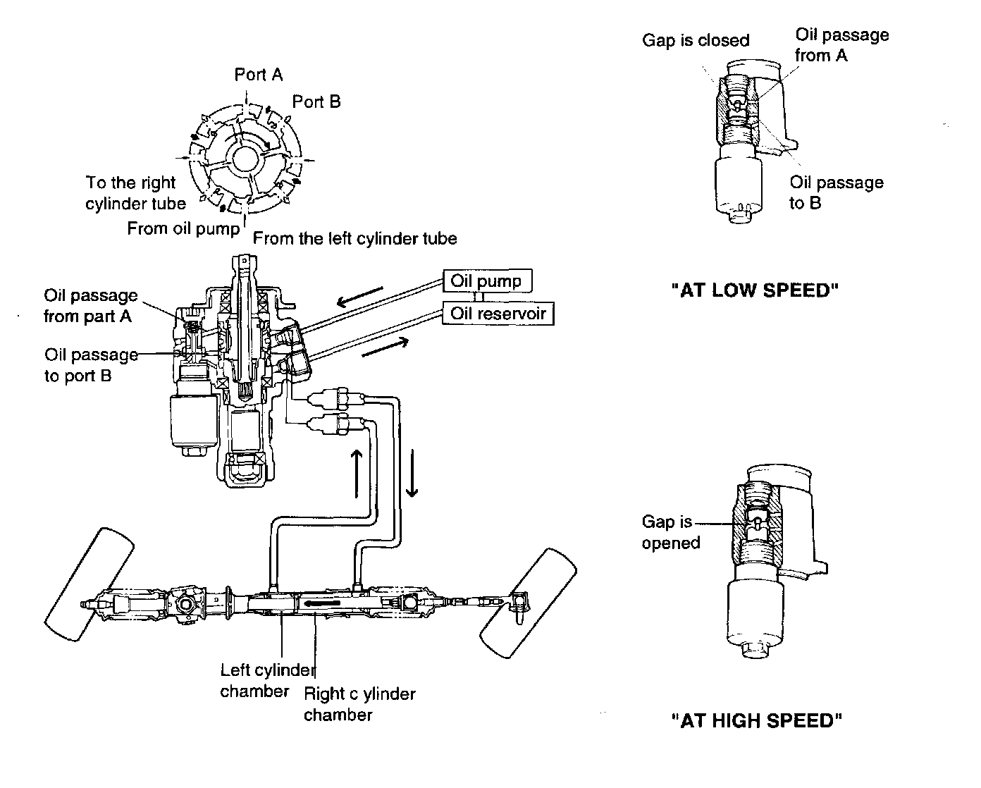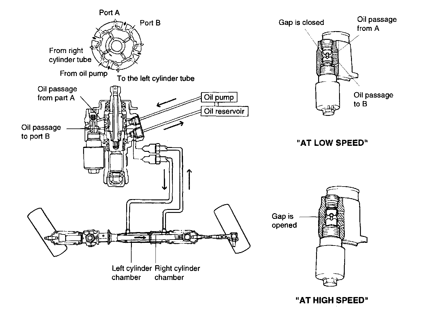 As the vehicle speed decreasing the hole of piston connecting the left chamber and right chamber is gradually closed the oil pressure produced by oil pump is delivered to the left chamber. Therefore, the steering effort is reduced.