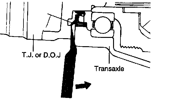 9. Insert a pry bar between the transaxle case and joint case (T.J or D.O.J), and pry the drive shaft from the transaxle case.
