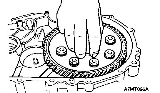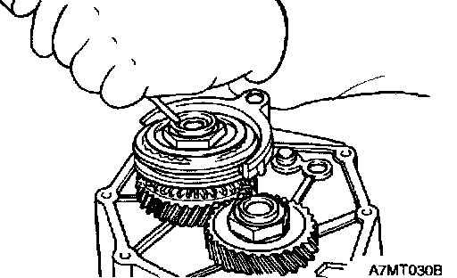 24. Install the snap ring, the 5th speed gear, needle roller bearing, synchronizer ring and synchronizer hub.