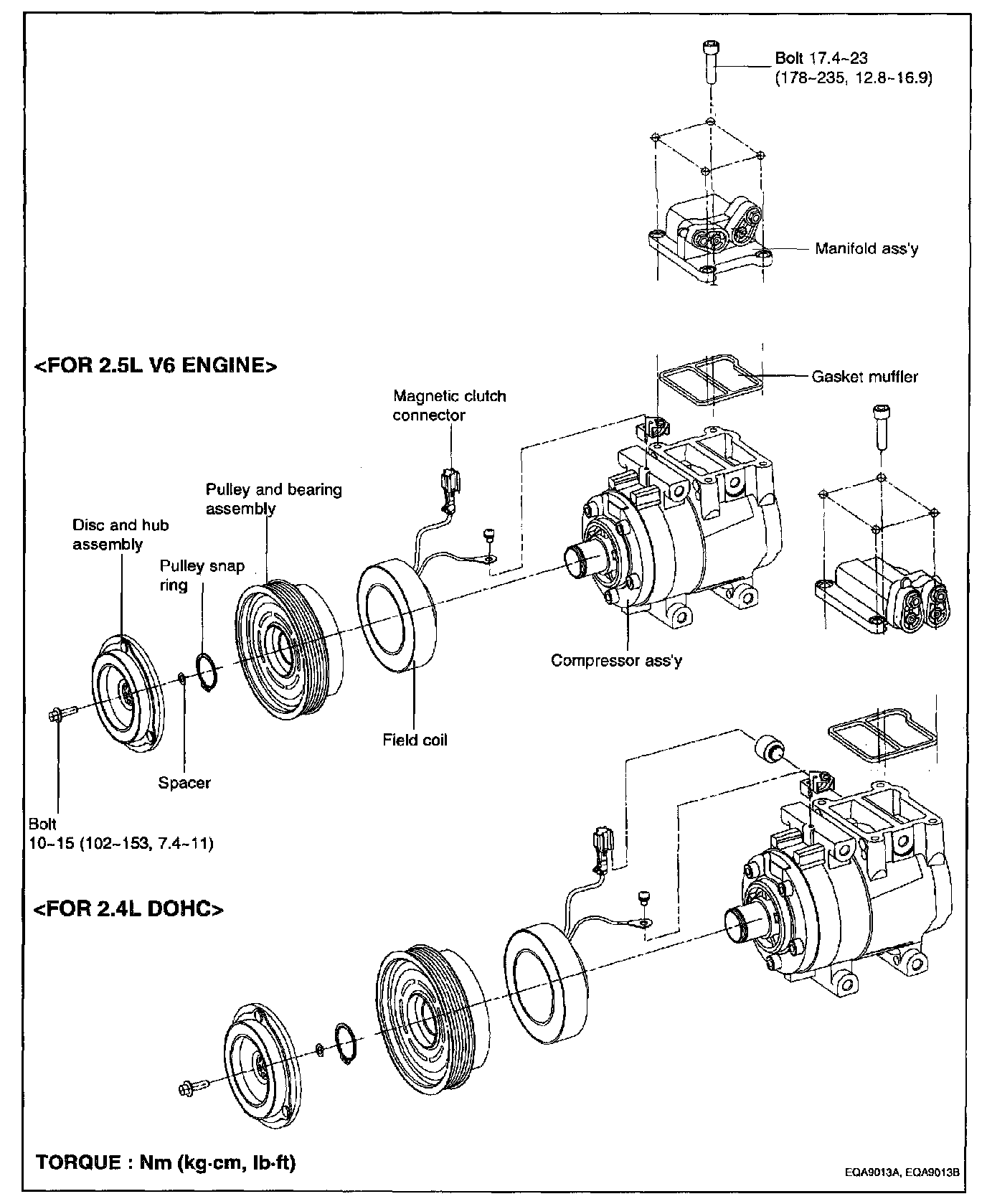 1. After reassembling the compressor assembly as the reverse of disassembly procedure given, check the clutch air gap between the clutch hub and the pulley mating surface with a feeler gauge.
