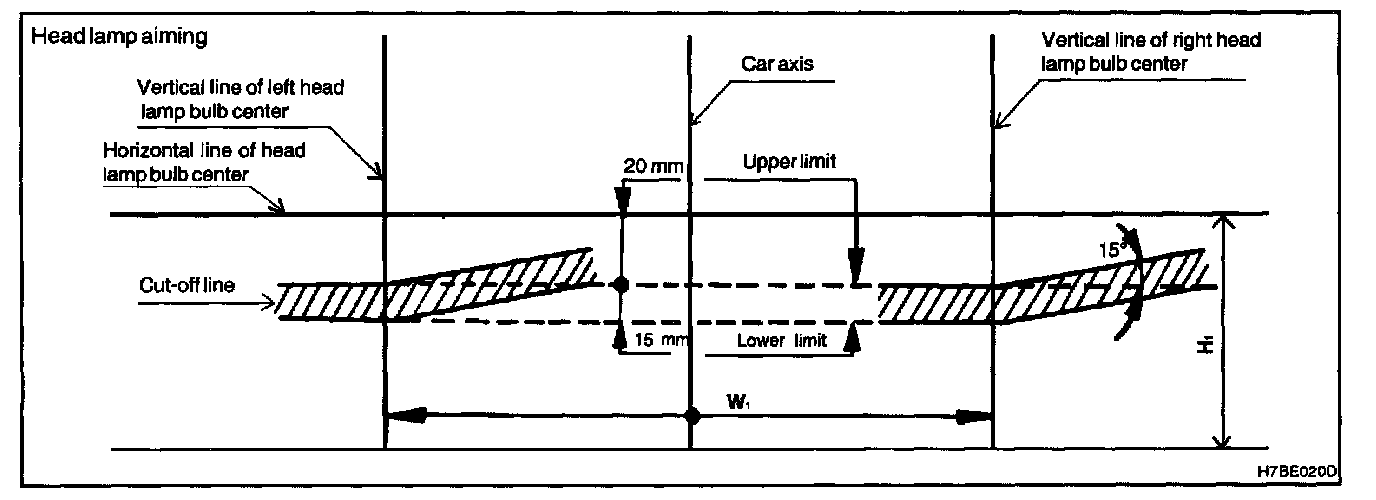- Turn ON the low beam without driver. The cut-off line is projected in the allowable range (shaded region).