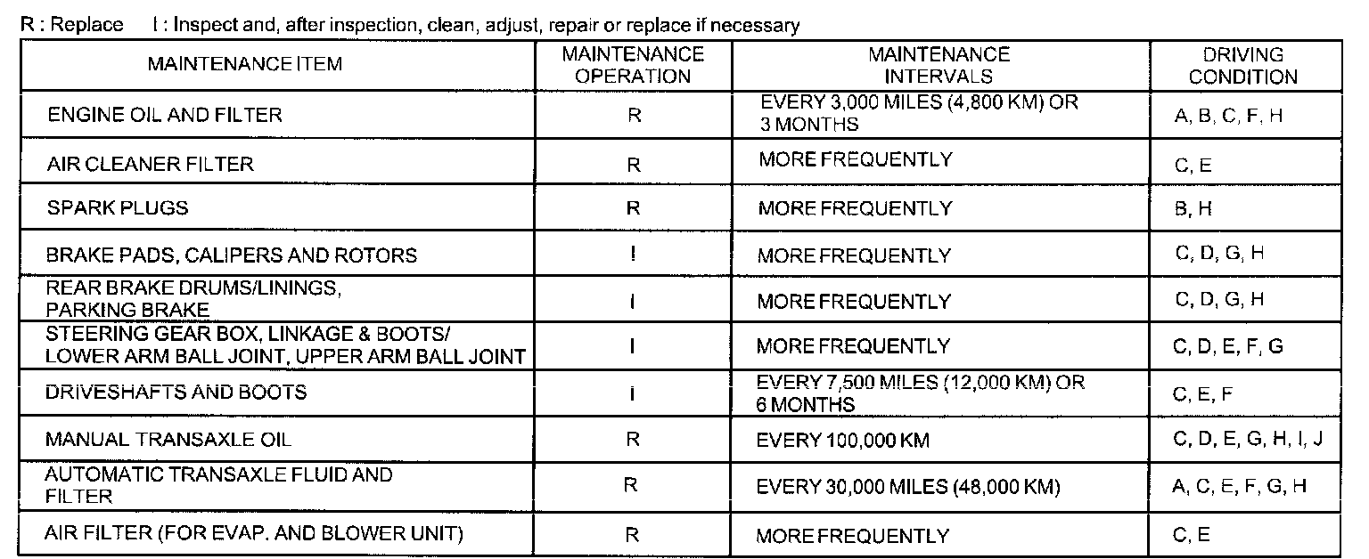 The following items must be serviced more frequently on cars normally used under severe driving conditions. Refer to the chart below for the appropriate maintenance intervals.