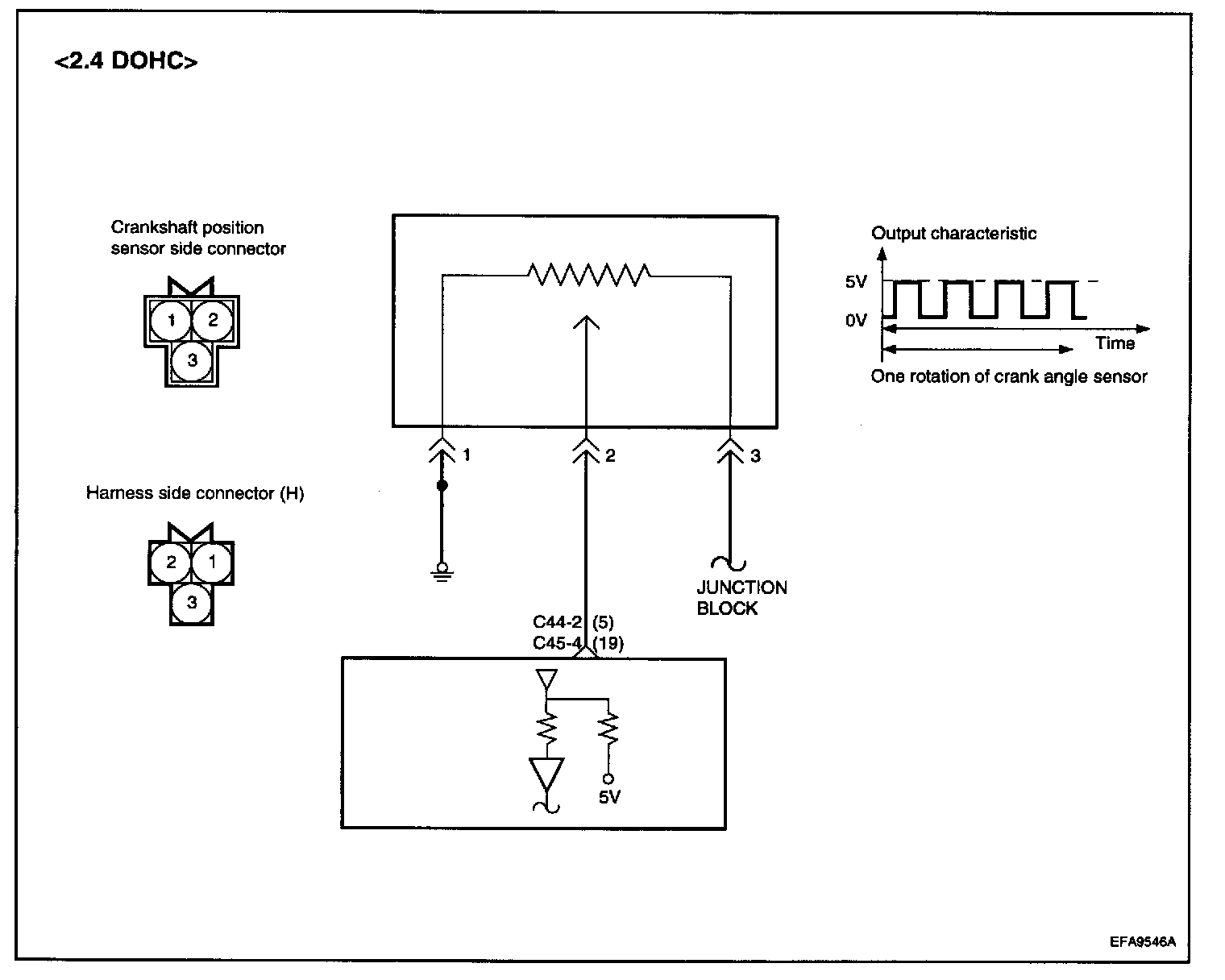 The crankshaft position sensor senses the crank angle (piston position) of each cylinder and converts it into a pulse signal. Based on the input signal, the ECM computes the engine speed and controls the fuel injection timing and ignition timing.Circuit Diagram: