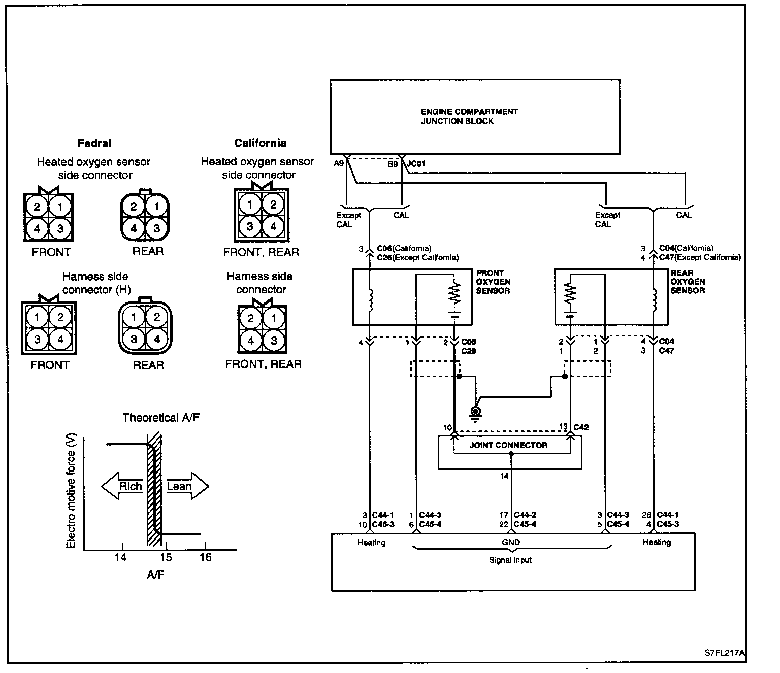 The heated oxygen sensor senses the oxygen concentration in exhaust gas, converts it in to a voltage, which is sent to the ECM. The oxygen sensor outputs about 1 V when the air fuel ratio is richer than the theoretical ratio, and outputs about 0 V when the ratio is leaner (higher oxygen concentration in exhaust gas.). The ECM controls the fuel injection ratio based on this signal so that the air fuel ratio is maintained at the theoretical ratio. The oxygen sensor has a heater element which ensures the sensor performance during all driving conditions.Circuit Diagram: