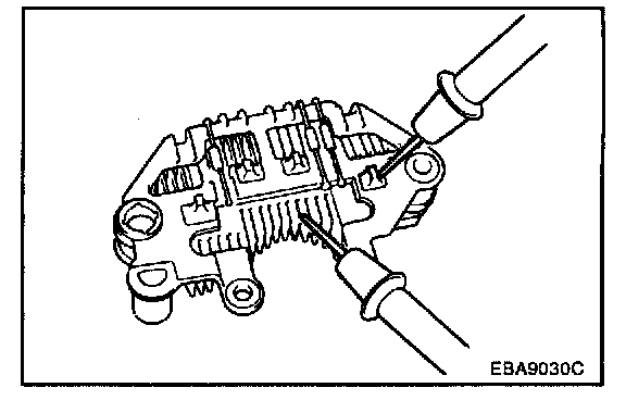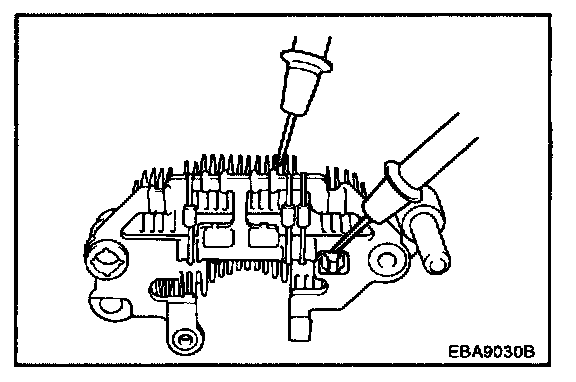 Check for continuity between the positive rectifier and stator coil lead connection terminal with an ohmmeter. The ohmmeter should read continuity in only one direction. If there is continuity in both directions, a diode is shorted.