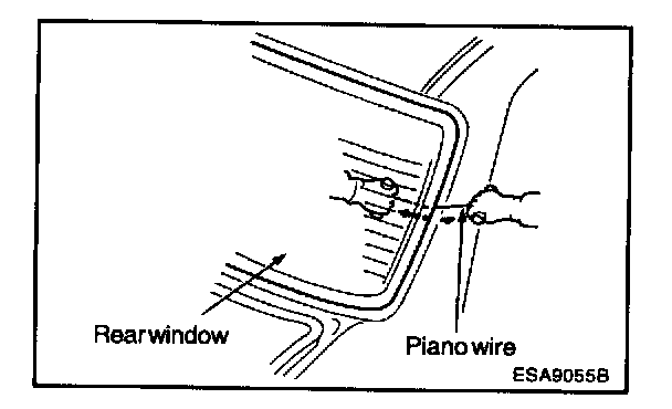 6. Using a sharp-point drill, make a hole in the rear window glass adhesive. Pass the piano wire from the inside of the vehicle through the hole. Pull the piano wire alternately from the inside and outside along the rear window glass to cut the adhesive.