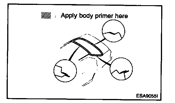 9. Apply the light coat of body primer to the original sealant remaining around the body flange. The glass should be installed 10 minutes after you apply the primer.