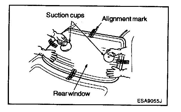 11. Using the suction cups or the Special Tool (09861-31400) to hold the rear window over the opening to align it with the alignment marks in and set it down on the adhesive. Lightly push on the rear window until its edges are fully seated on the adhesive all the way around.