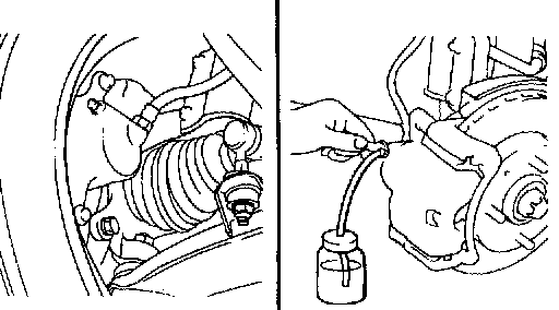 2. Connect a vinyl tube to the wheel cylinder bleeder screw and insert the other end of tube in a half full container of brake fluid.