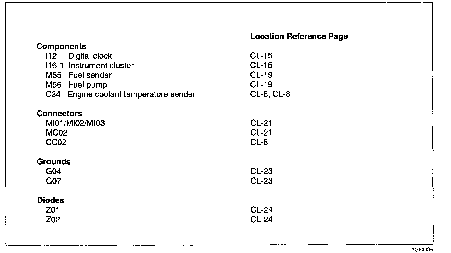 When you want to locate the schematic components on the vehicle, use the Component Location Index which follows each schematic. A Component Location Index lists major components, connectors, grounds, diodes, and their physical location.