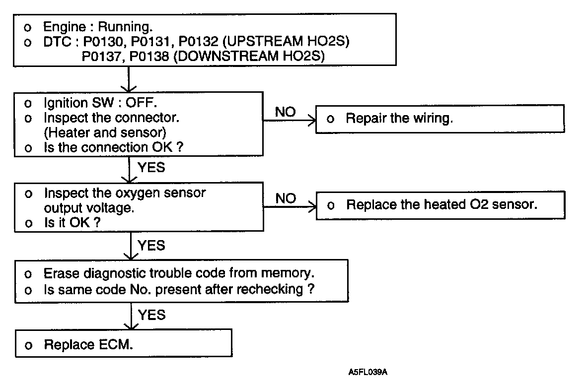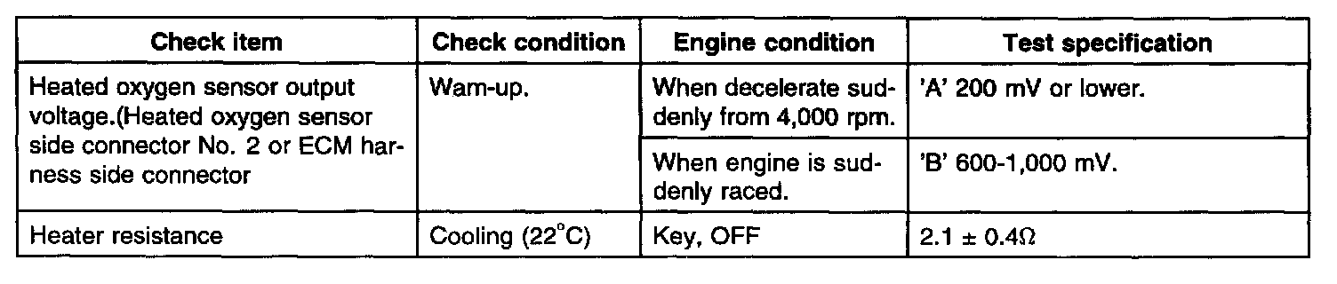 2. If the heated oxygen sensor check has been normal, but the sensor output voltage is out of specification, check the following items related to the air fuel ratio control system.
