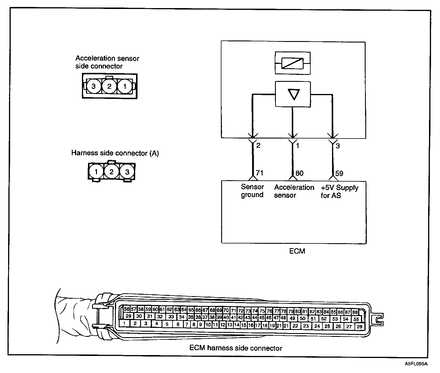 The acceleration sensor is attached in the engine compartment on the driver's side. While driving, the rough road condition is sensed by the acceleration sensor and the ECM uses this input signal to avoid the wrong misfire detection.
