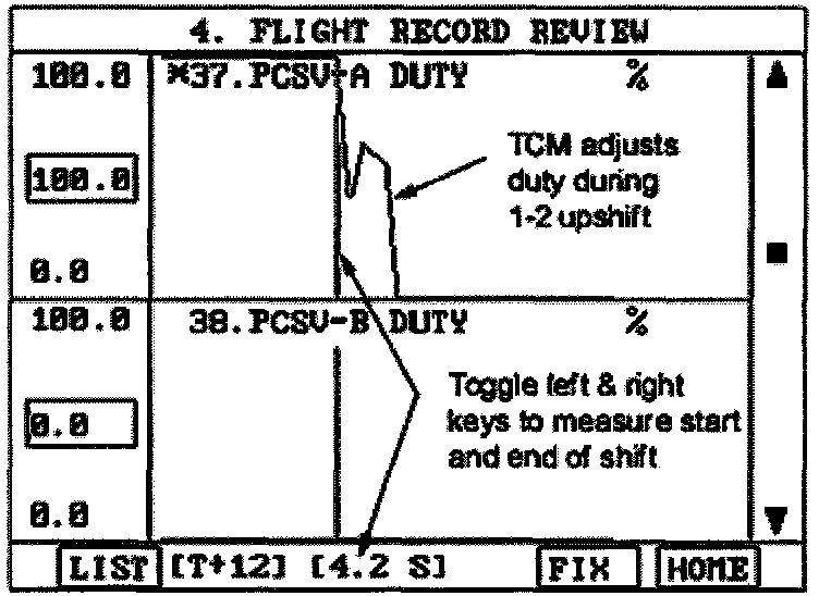 Toggle the left and right keys to measure the start and end of each shift, then subtract the two numbers. If any shift requires more than 2.0 seconds, swap a TCM from a properly operating vehicle: