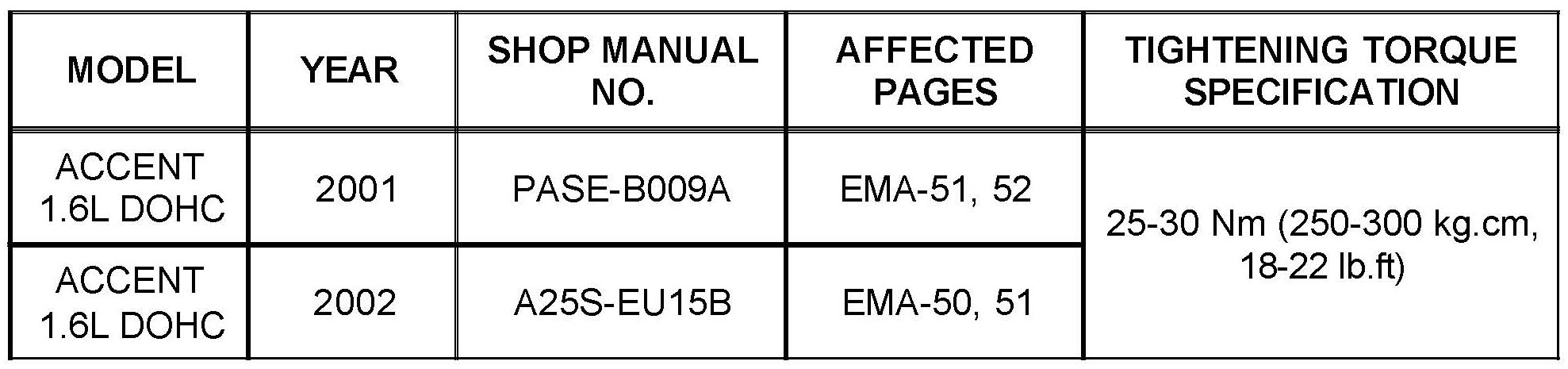 2001-2002 MY ACCENT vehicles with 1.6L DOHC engines.