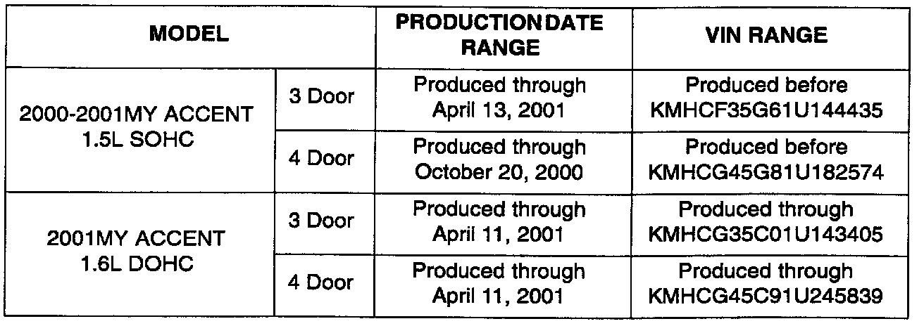 ^ Model: 2000-2001 ACCENT vehicles with 1.5L SOHC and 1.6L DOHC engines