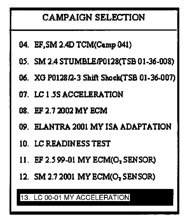 3. Select menu option "13. LC 00-01 MY ACCELERATION" and press ENTER.