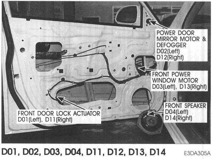 D01,D011-Front Door Lock Actuator(Left And Right), D02,D12-Power Door Mirror Motor And Defogger(Left And Right), D03,D13-Front Power Window Motor(Left And Right), D04,D14-Front Speaker(Left And Right):