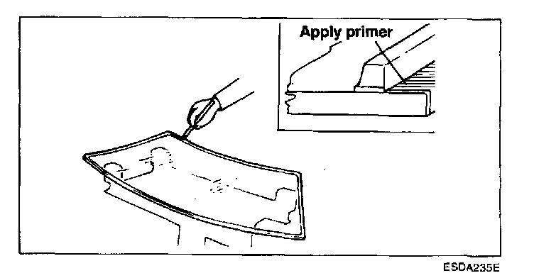 1. Never touch the primed surfaces with your hand. If you do, the adhesive may not bond to the glass properly causing a leak after the rear window glass is installed.