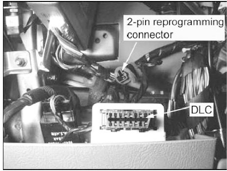 7. 2000-01 ACCENT produced prior to 3/30/01: Connect the white 2-pin reprogramming connector to the vehicle black 2-pin TCM reprogramming connector under the dash. The 2-pin connector is located 6 above the Data Link Connector (DLC).
