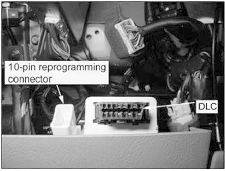 8. 2001 Accent produced from 3/30/01 and 2002 Accent: Connect the white 10-pin reprogramming connector to the vehicle white 10-pin TCM reprogramming connector under the dash. The 10-pin connector is located next to the DLC.