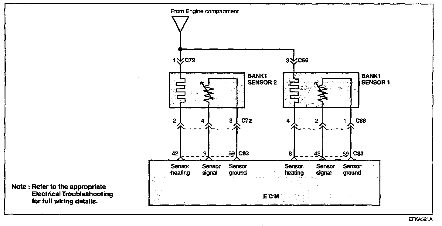 The heated oxygen sensor senses the oxygen concentration in the exhaust gas, then converts it into a voltage and then sends this to the ECM. The heated oxygen sensor gives an output of about 800 mV when the air fuel ratio is richer than the theoretical ratio and output of about 100 mV when the ratio is leaner (higher oxygen concentration in exhaust gas.) The ECM controls fuel injection based on this signal so that the air fuel ratio is maintained at the theoretical ratio.