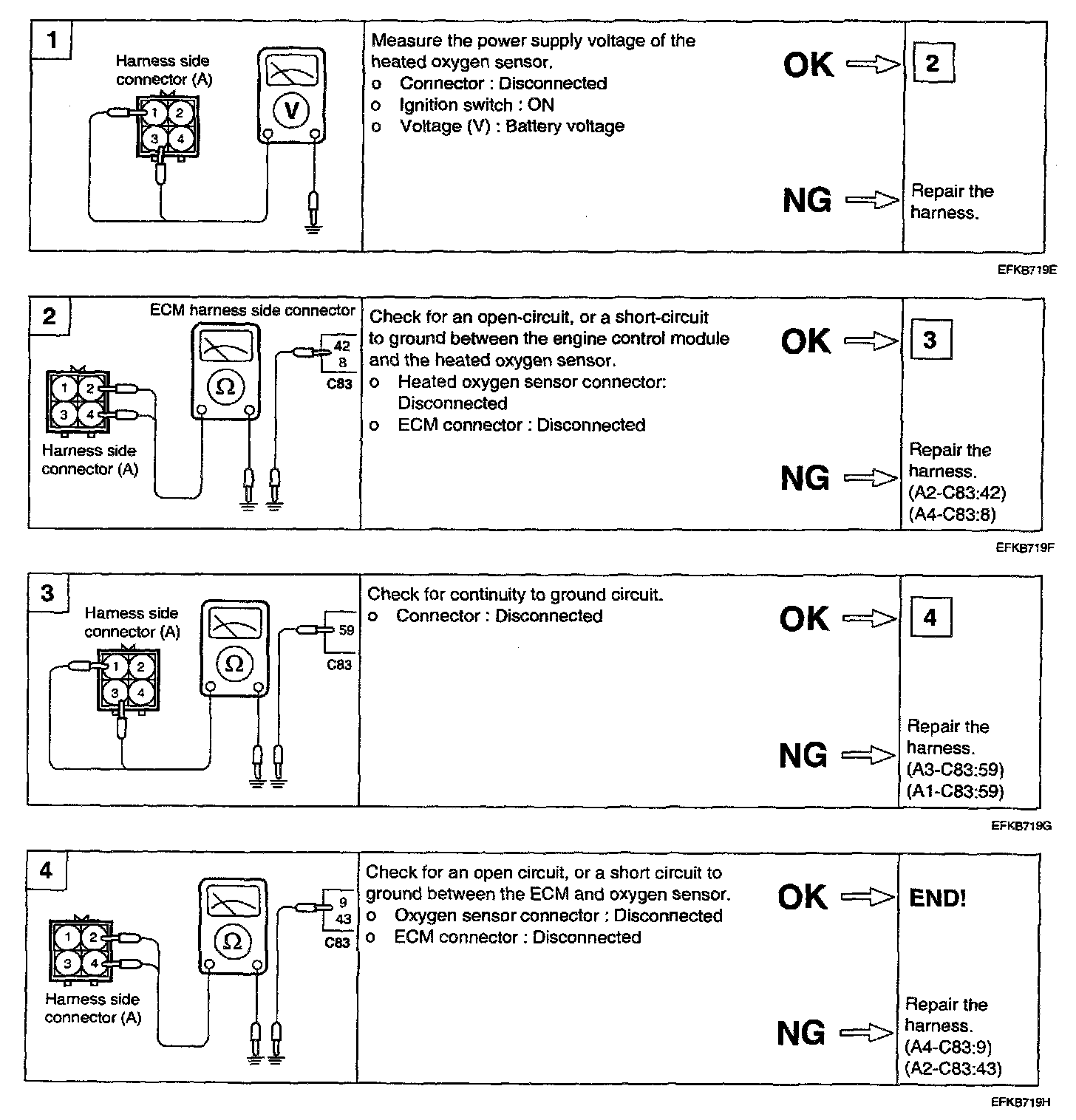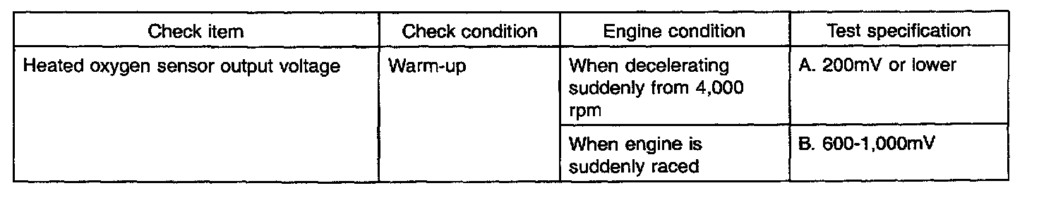 2. If the heated oxygen sensor check is normal but the sensor output voltage is out of specification, check for the following items related to the air fuel ratio control system: