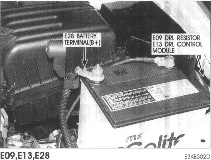 E09 DRL Resistor, E13 DRL Control Module, E28 Battery Terminal (+):