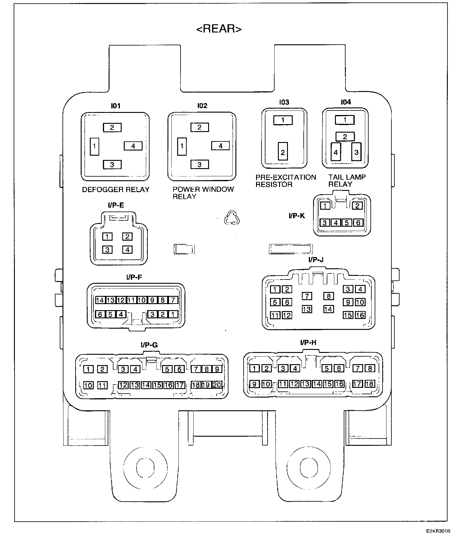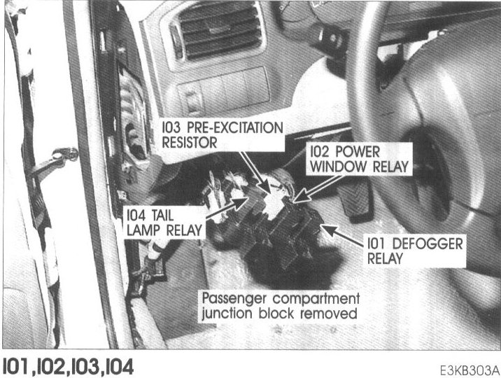 I01 Defogger Relay, I02 Power Window Relay, I03 Pre-excitation Resistor, I04 Tail Lamp Relay: