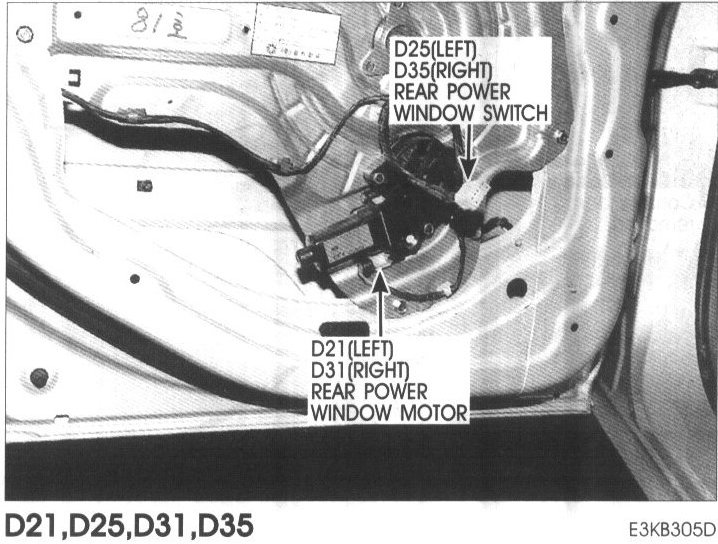 D21 (Left), D31 (Right) Rear Power Window Motor, D25 (Left), D35 (Right) Rear Power Window Switch:
