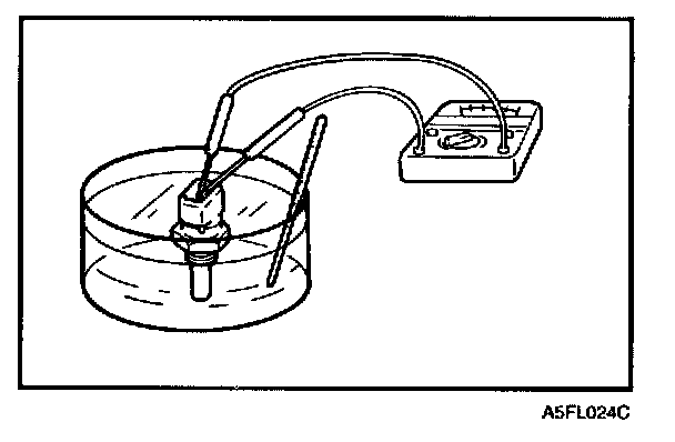 2. With temperature sensing portion of engine coolant temperature sensor immersed in hot engine coolant, check resistance.