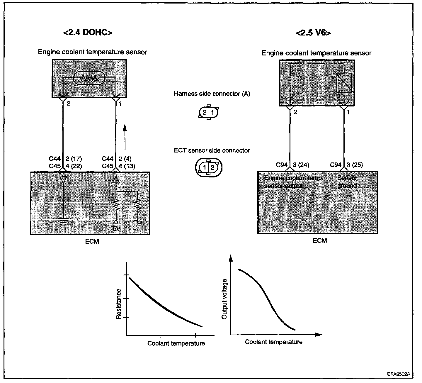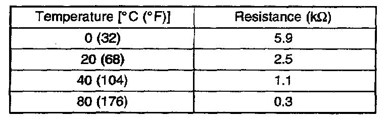 The engine coolant temperature sensor is installed in the engine coolant passage of the cylinder head, detects engine coolant temperature and emits signals to the ECM. This part employs a thermistor which is sensitive to changes in temperature. The electric resistance of a thermistor decreases in response to temperature rise. The ECM judges engine coolant temperature by the sensor output voltage and provides optimum fuel enrichment when the engine is cold.