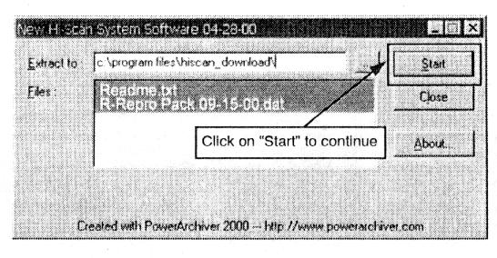 8. After about 10 minutes of downloading, this window will pop up. Just click "Start" and the new Hi-Scan Software will be automatically placed in the proper directory.