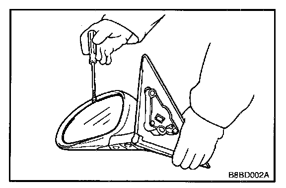 1. Insert a flat tip screwdriver between the outside rearview mirror holder and mirror assembly.