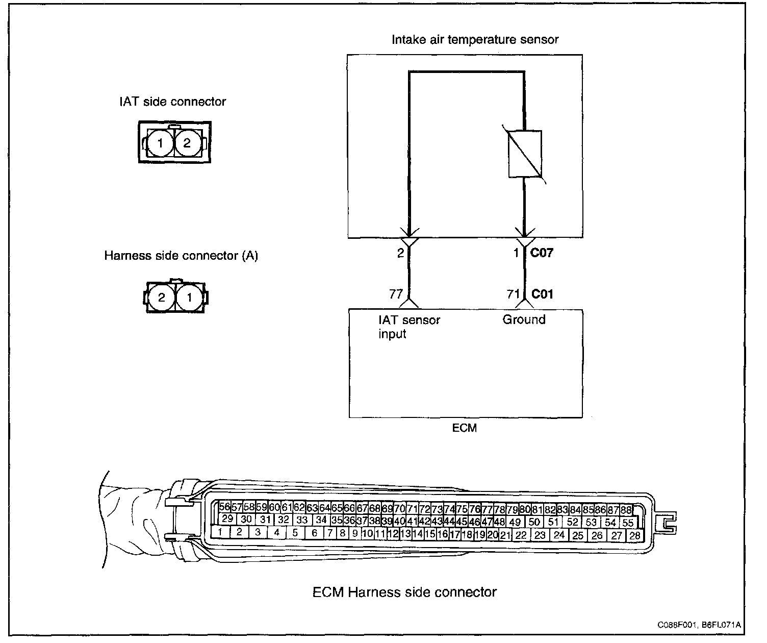 The intake air temperature sensor (IAT Sensor) located in the intake air hose, is a resistor-based sensor for detecting the intake air temperature.
