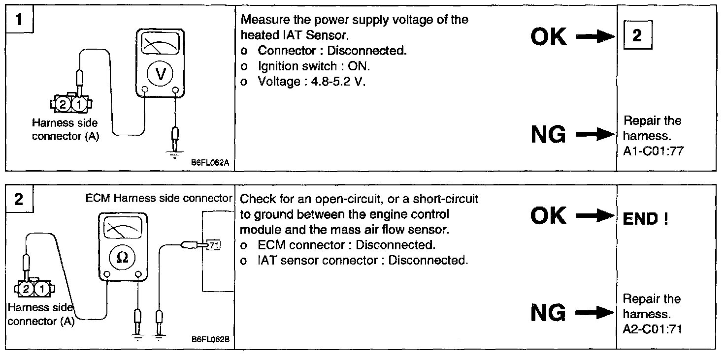 2. Measure the voltage between the IAT sensor terminal 1 and 2