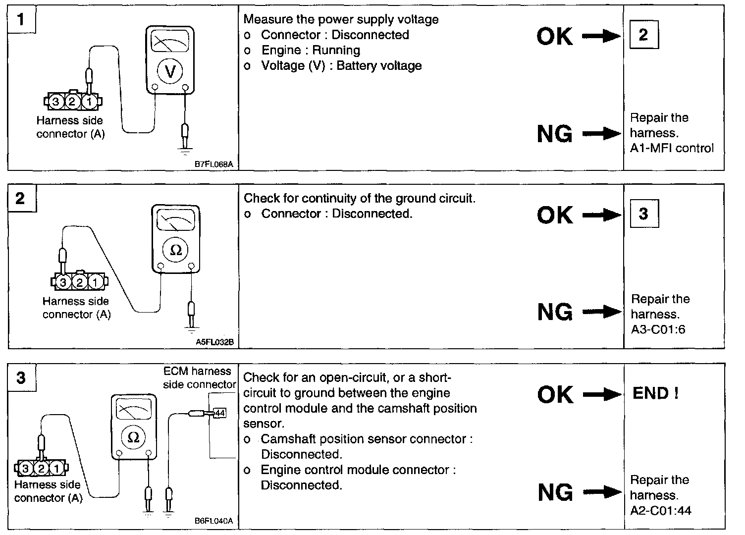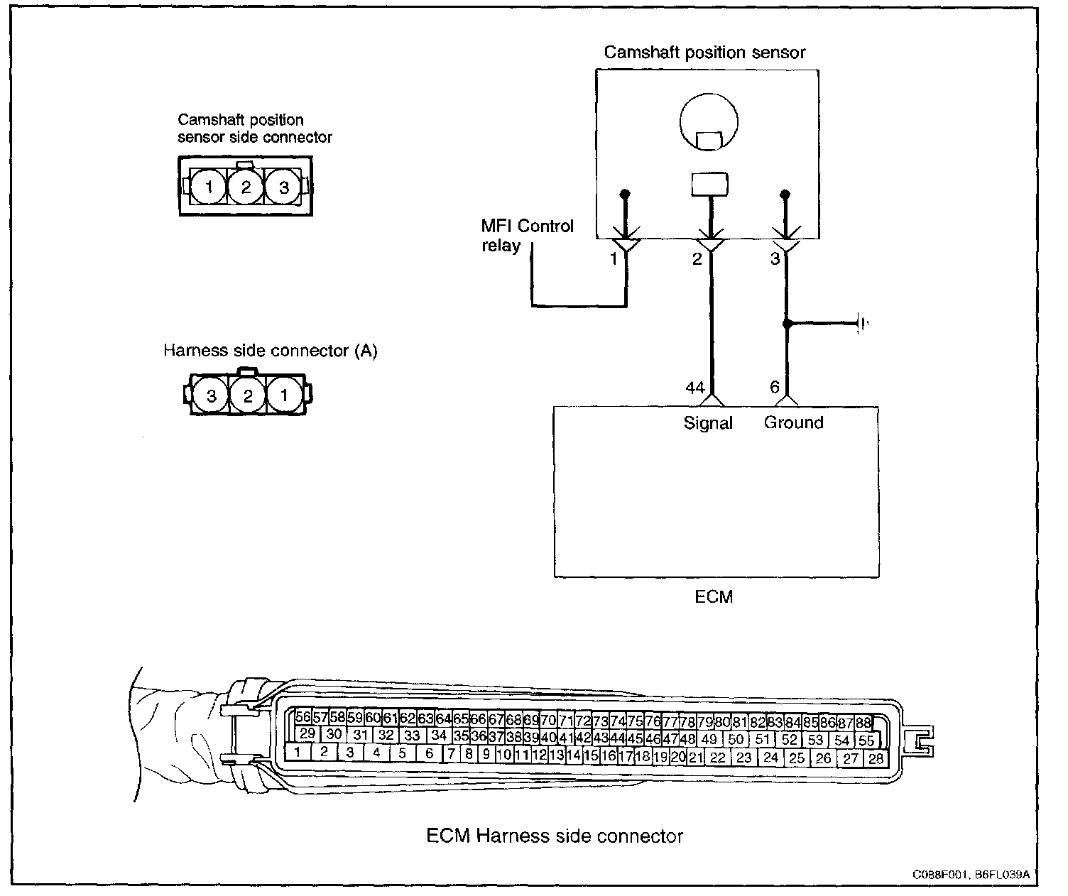 Camshaft position sensor (CMP Sensor) senses the TDC point of No.1 cylinder in its compression stroke, whose signals are fed to ECM to be used to determine the sequence of the fuel injection.