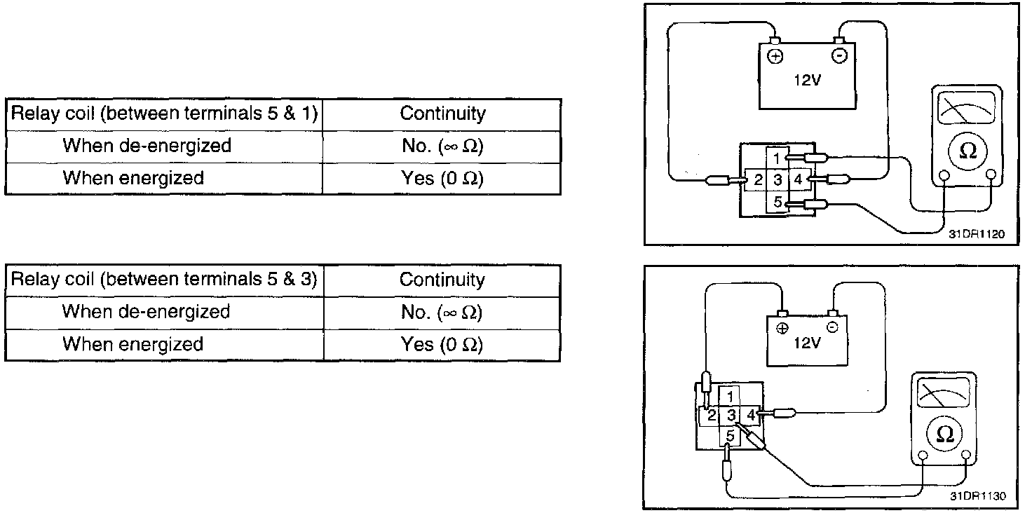 1. Check continuity of relay contacts between terminal 4 (-) and 2 (+).