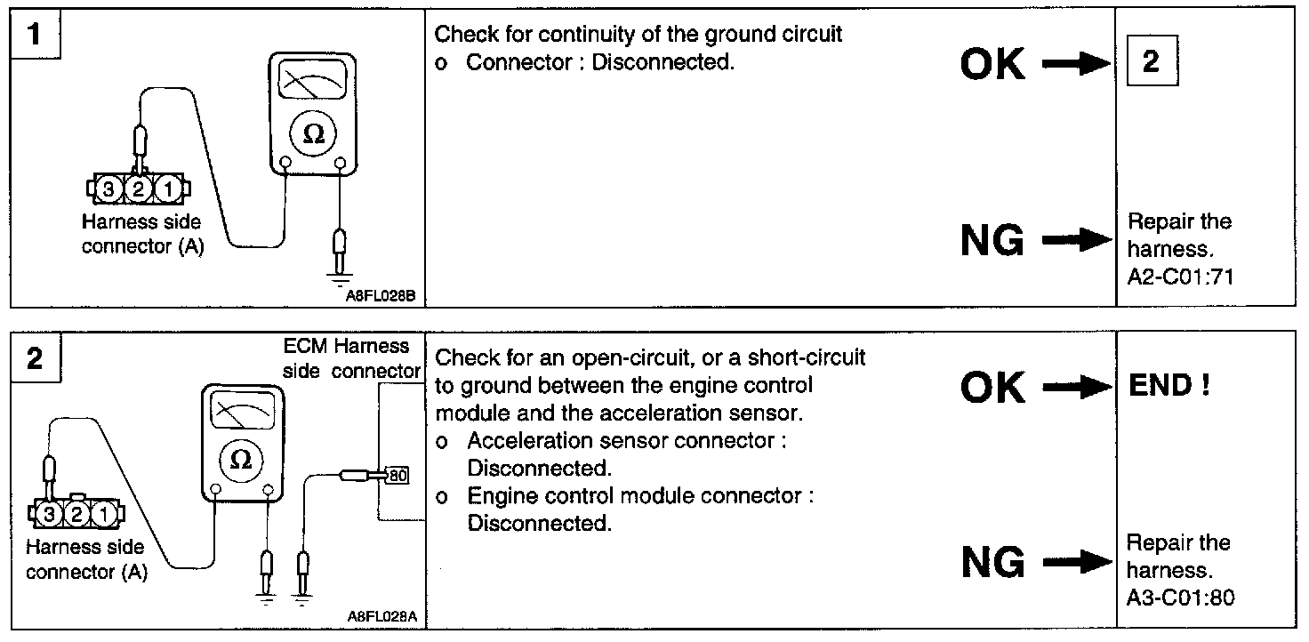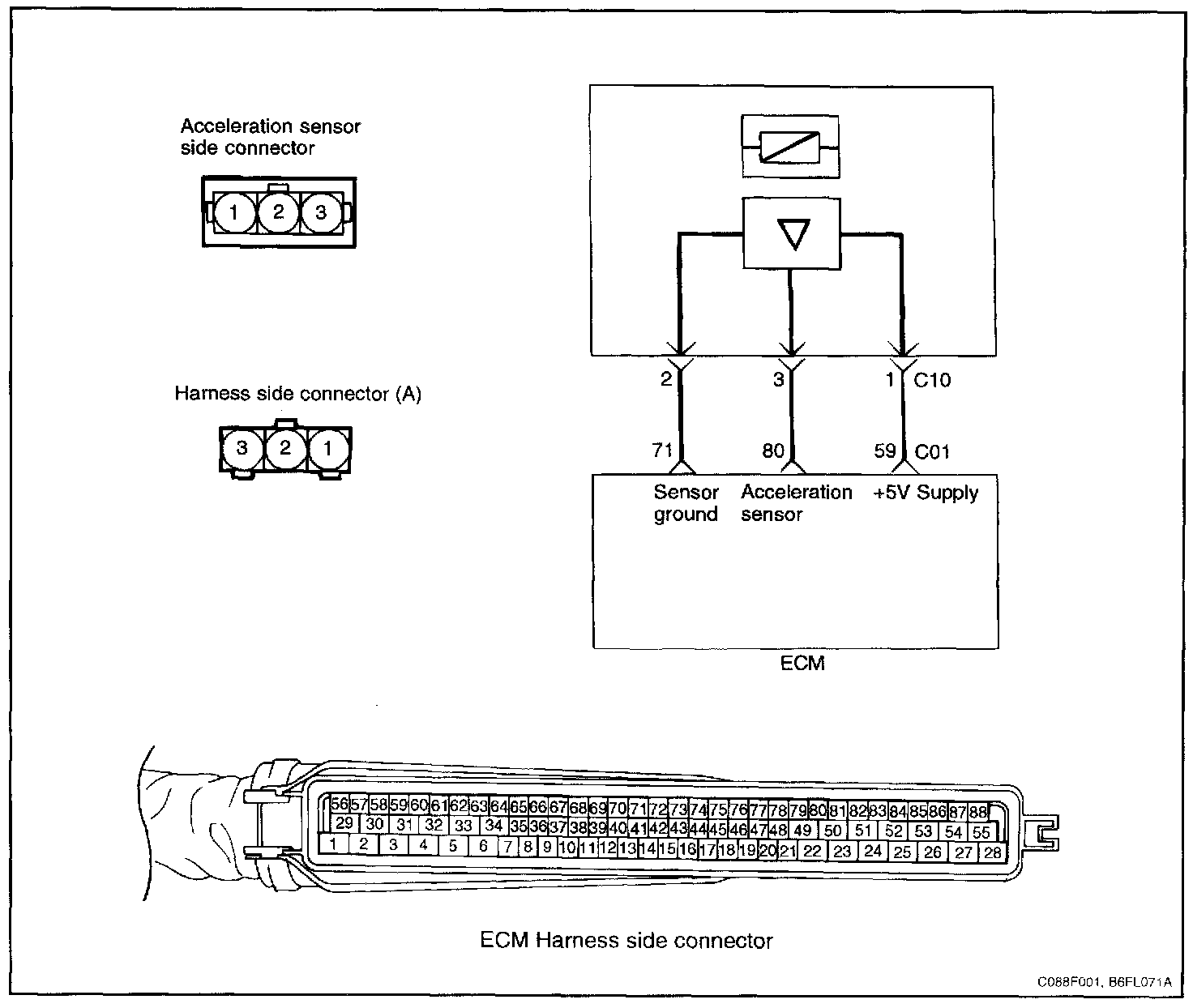 The acceleration sensor is attached in the engine compartment on the driver's side. While driving, the rough road condition is sensed by the acceleration sensor and the ECM uses this input signal to avoid the wrong misfire detection.