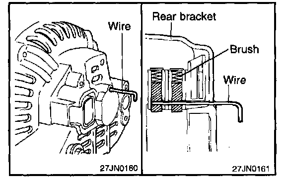 Before the rotor is attached to the rear bracket, insert a wire through the small hole in the rear bracket to lock the brush. After the rotor has been installed, the wire can be removed.