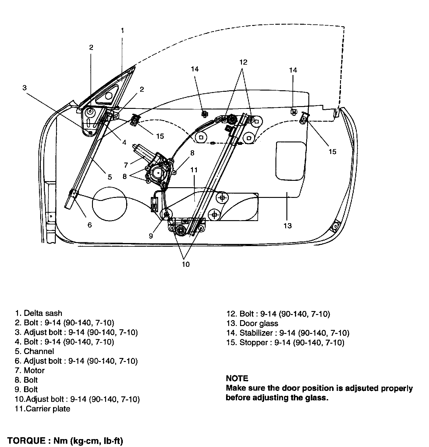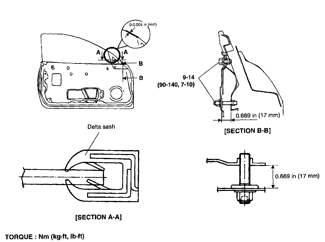 1. Adjust the delta sash by using the delta sash adjust bolt at the bottom of the sash (Distance between the delta sash and the door inner panel : 0.669 in (1 7 mm).