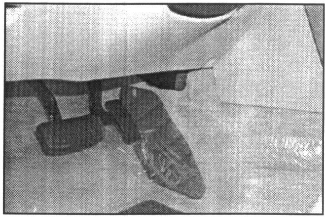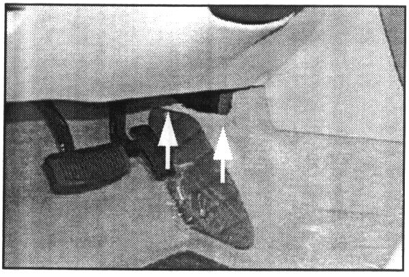 1. Open the driver's side door. Using a trim clip removal tool, remove the plastic clips (2 each) and pull the carpeting down.